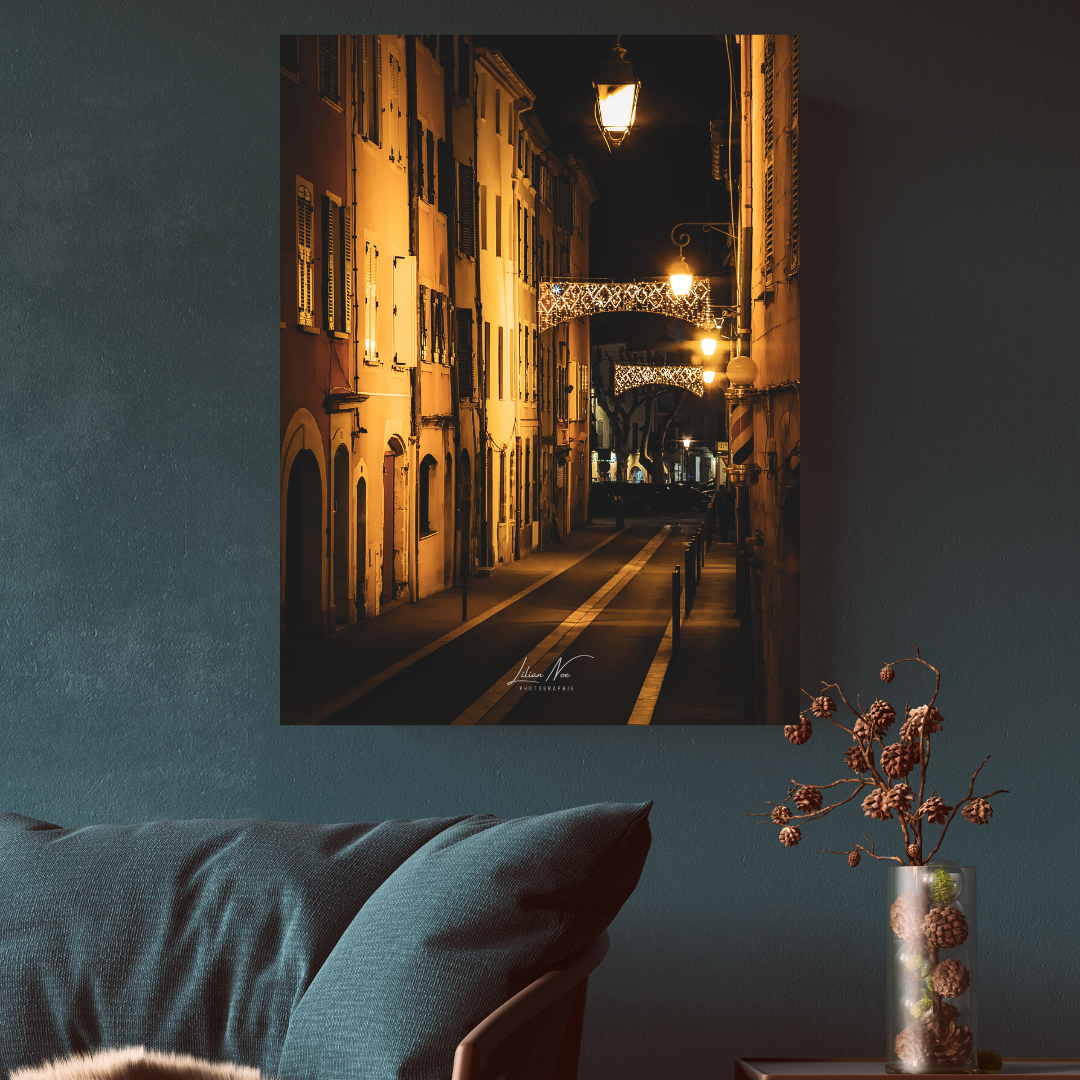 « Célébrez la beauté pittoresque du village provençal de Cuers avec notre poster capturant l’atmosphère chaleureuse de ses rues de nuit. Les lumières douces, les façades rustiques et le charme intemporel créent une scène visuelle captivante, évoquant la tranquillité et la beauté de ce village provençal. Ajoutez une touche de romantisme et de sérénité à votre espace avec ce poster, célébrant la magie nocturne de Cuers. »