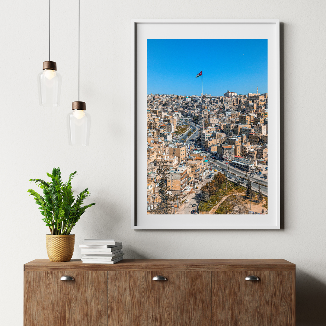 Cette image montre une vue imprenable d’Amman prise depuis la Citadelle. La ville s’étend sur des collines avec ses bâtiments blancs et beiges. Au centre, un grand drapeau jordanien flotte majestueusement. Le ciel bleu éclatant domine la scène, mettant en valeur l’horizon urbain.
