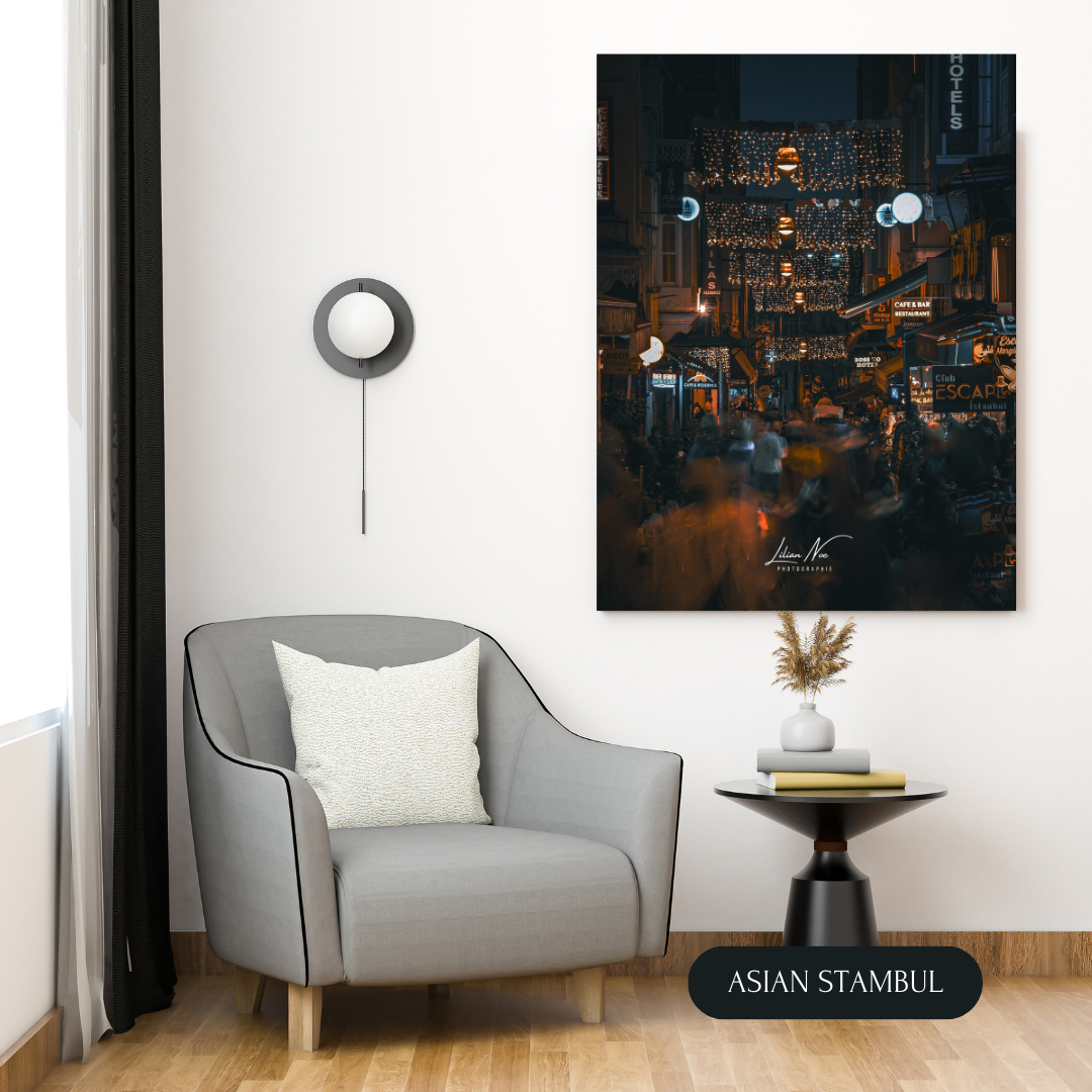 « Transformez votre espace avec notre poster captivant d’une rue animée d’Istanbul, illuminée sous la douce lueur nocturne. Des effets de mouvement capturés artistiquement révèlent l’activité trépidante de la vie nocturne. Les lumières chatoyantes des enseignes et des véhicules créent une toile dynamique, transportant instantanément votre espace dans l’énergie vibrante d’Istanbul après le coucher du soleil. Une pièce visuelle qui allie l’effervescence urbaine à une esthétique moderne et captivante. »