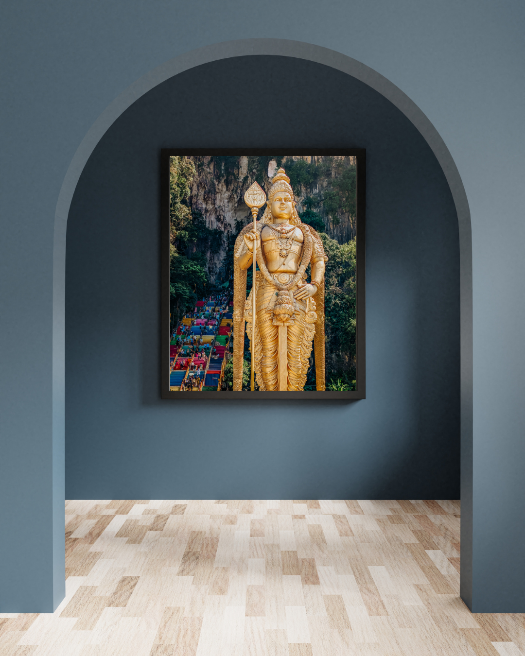 Vue emblématique d’un site spirituel majeur, où la statue monumentale et les marches colorées créent une composition puissante et symbolique.