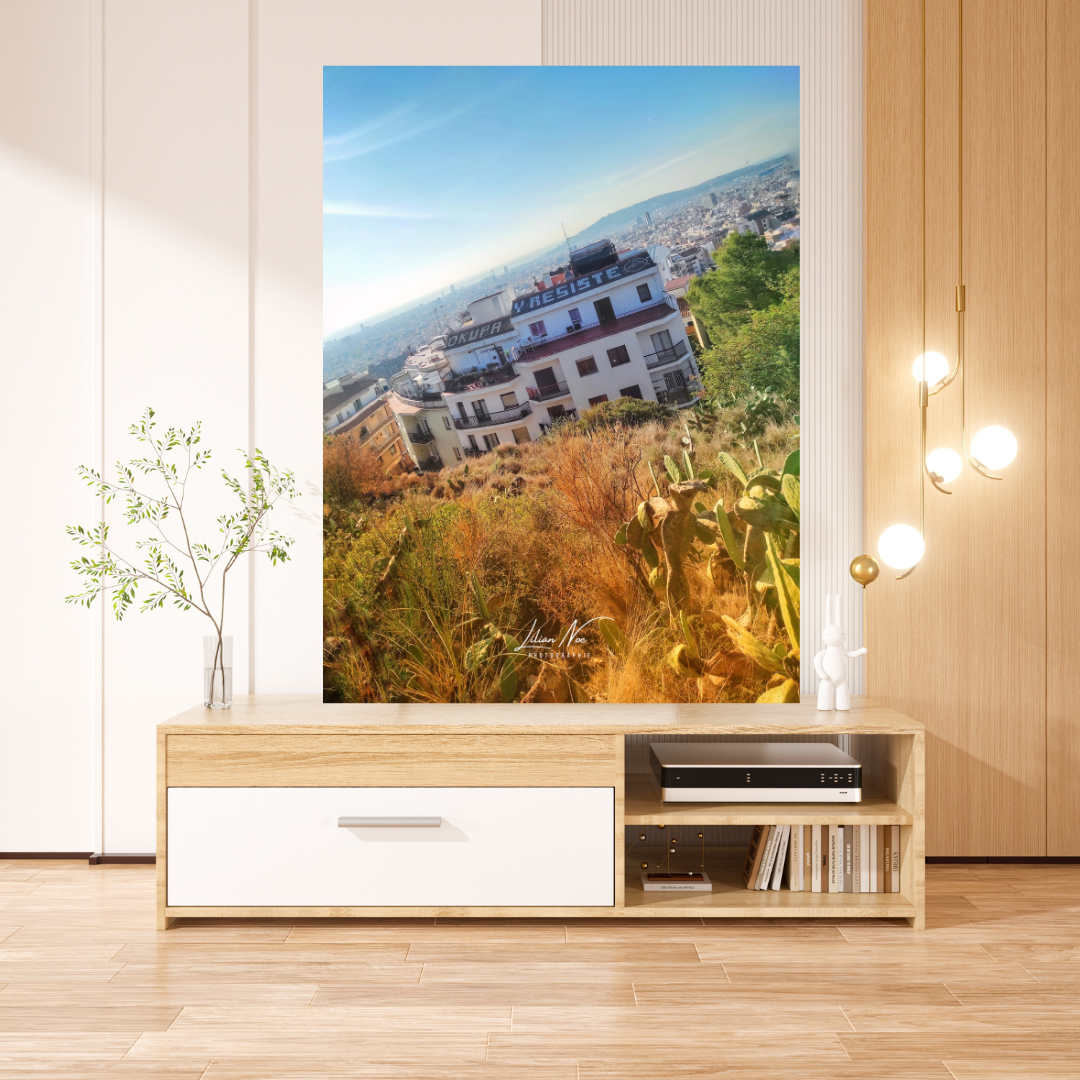 « Célèbrez la résilience catalane avec notre poster mettant en avant le toit symbolique de Barcelone représentant la résistance. La vue en contrebas sur la ville crée une perspective captivante, évoquant à la fois l’histoire et la force de la culture catalane. Ajoutez une touche de fierté et d’authenticité à votre espace avec ce poster, célébrant la résistance catalane et la beauté de Barcelone. »
