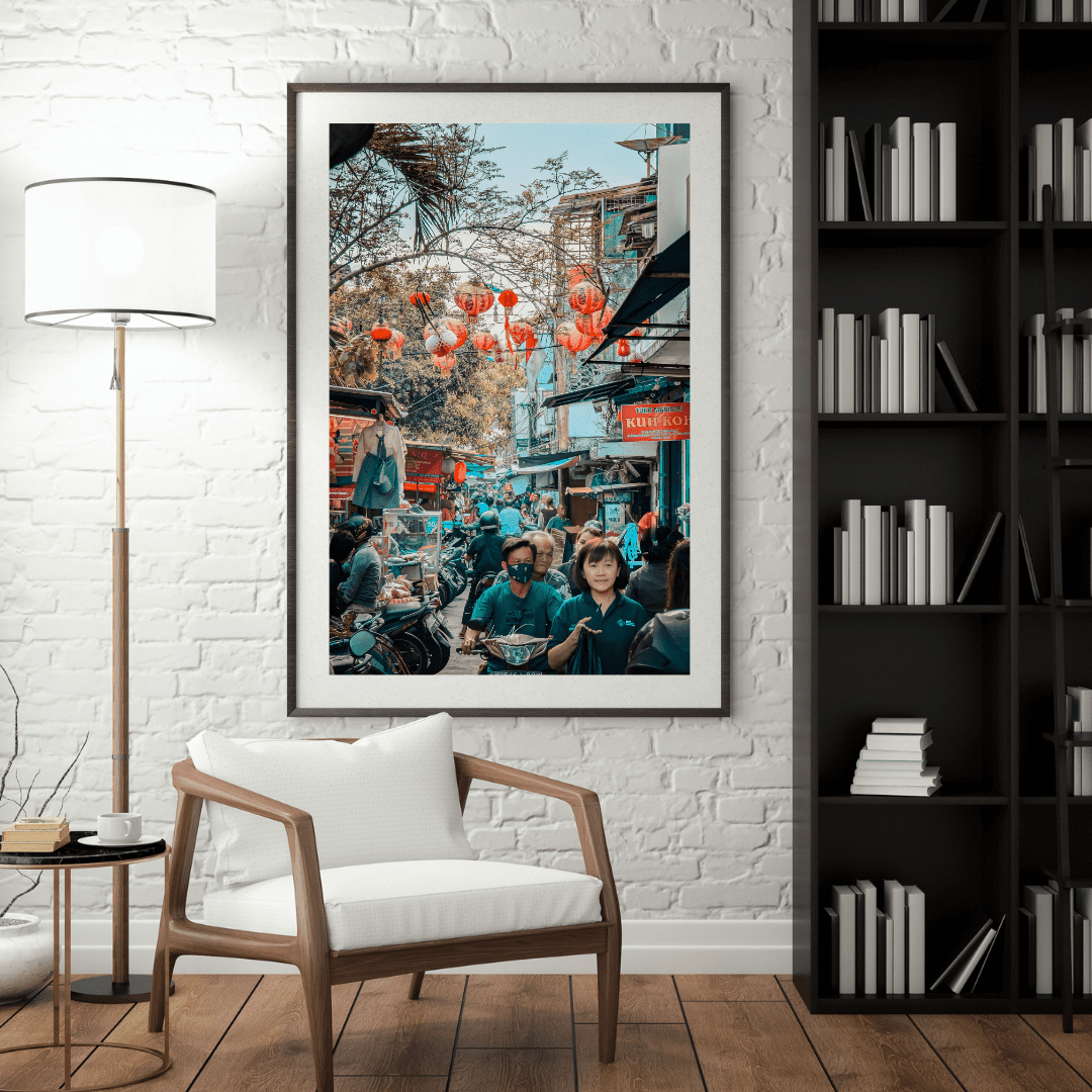 Des lanternes rouges suspendues au-dessus des têtes apportent une touche festive et traditionnelle à la scène.