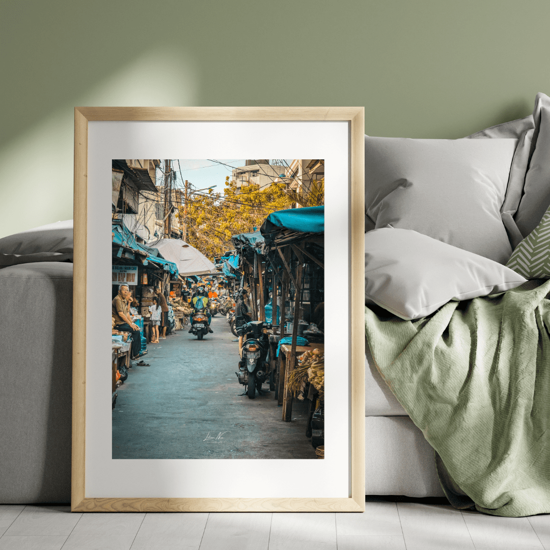 Une rue de marché animée, avec des étals colorés débordant de fruits tropicaux et de légumes frais. Des scooters zigzaguent habilement parmi les piétons, laissant derrière eux une traînée de bruit et d’odeur d’essence.
