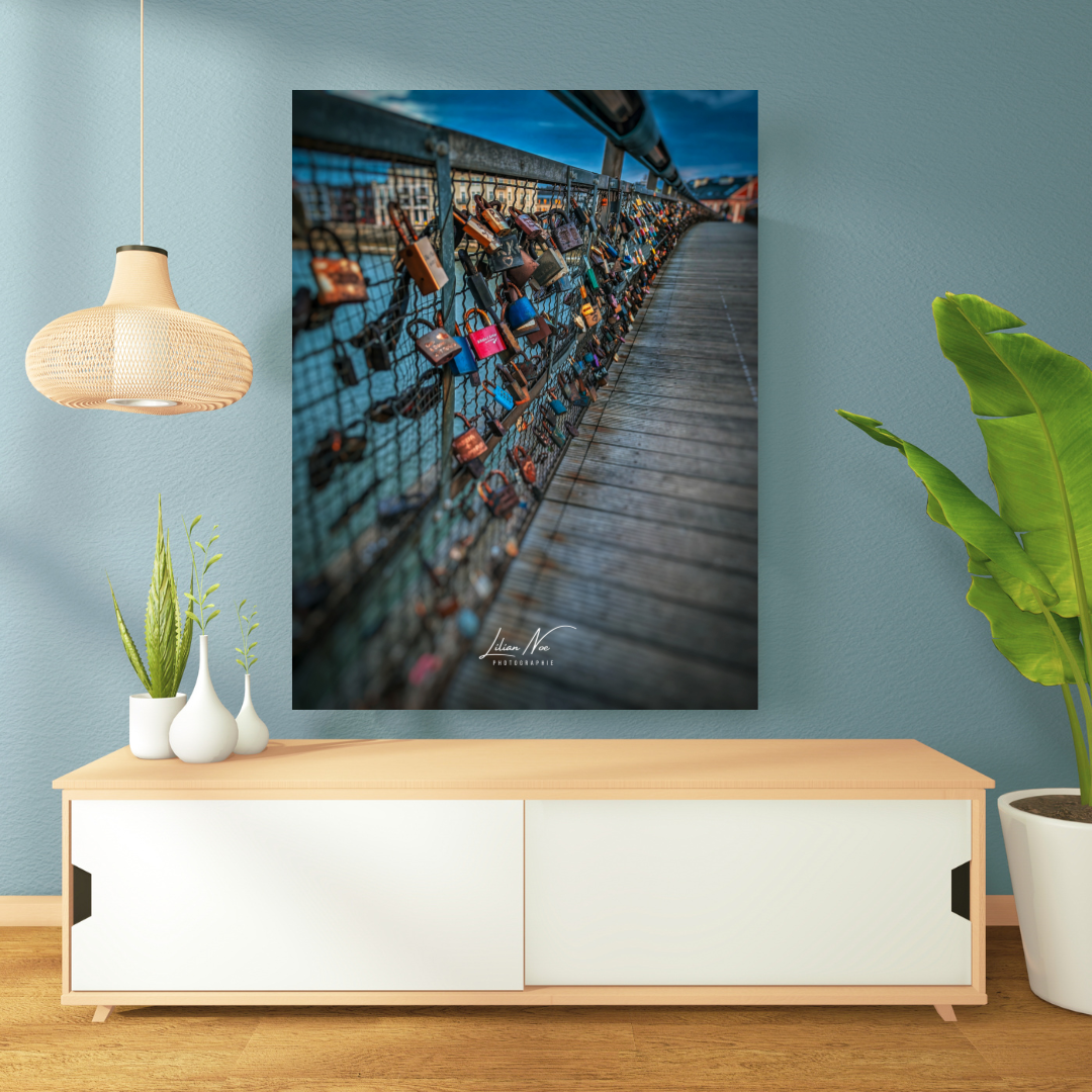 « Capturez l’amour éternel avec notre poster mettant en avant le Pont des Amours à Cracovie, où les amoureux scellent leur lien avec des cadenas au crépuscule. L’atmosphère romantique de ce lieu emblématique est sublimée dans une scène visuelle envoûtante. Idéal pour créer une ambiance romantique dans votre espace, ce poster transporte le charme du Pont des Amours et ses traditions captivantes directement chez vous. »
