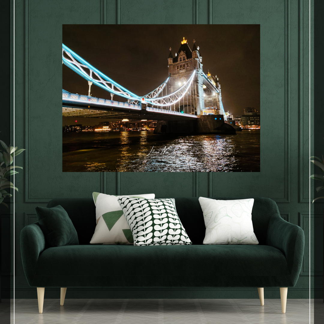 « Capturez la majesté intemporelle de Londres avec notre poster mettant en avant le célèbre Tower Bridge. La silhouette emblématique du pont, éclairée par des lumières douces, crée une scène visuelle impressionnante. Ajoutez une touche de l’âme londonienne à votre espace avec ce poster, évoquant l’élégance et la grandeur de l’un des symboles les plus emblématiques de la ville. »