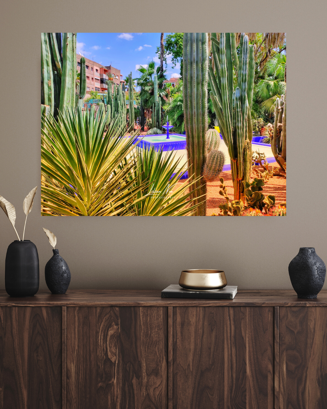 « Explorez l’éclat vibrant du jardin Majorelle avec notre poster mettant en avant une fontaine entourée de cactus aux couleurs vives. La palette vivante de verts, de bleus et de roses crée une scène visuelle enchanteresse, capturant la beauté artistique de ce célèbre jardin. Ajoutez une touche de l’atmosphère exotique et colorée du jardin Majorelle à votre espace avec ce poster, évoquant la magie botanique de Marrakech. »