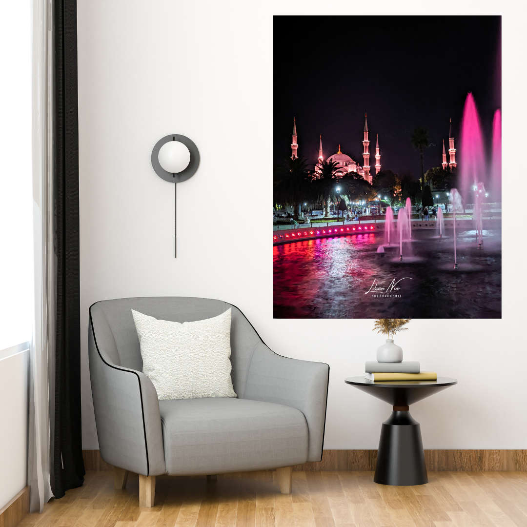« Envoûtez votre espace avec notre poster captivant de la Mosquée Bleue d’Istanbul, baignée de rose sous la douce lumière de la nuit. La fontaine devant ajoute une touche de sérénité à cette scène majestueuse. Un spectacle nocturne qui évoque la magie de l’architecture ottomane, créant une atmosphère apaisante et élégante. Parfait pour les amoureux de l’histoire et les amateurs de beauté nocturne. »