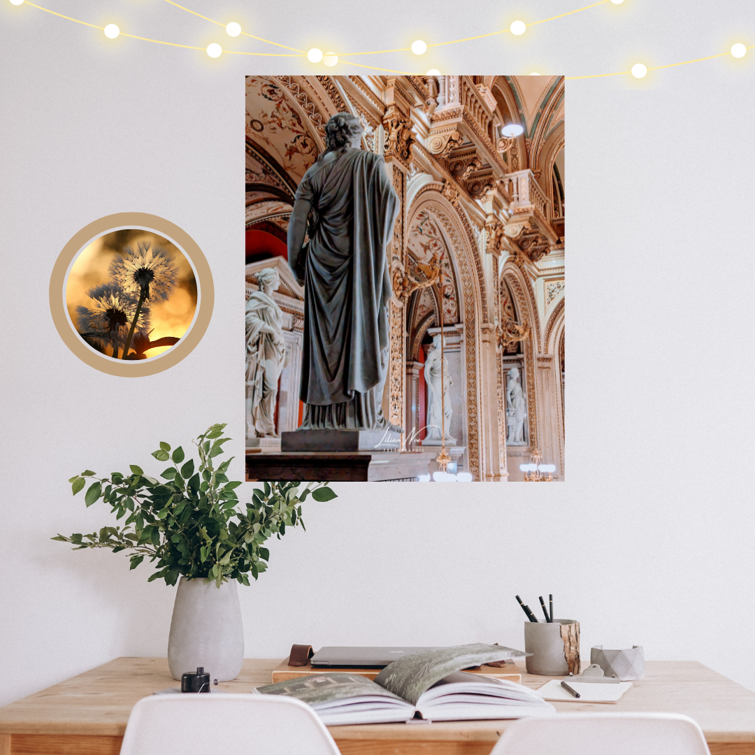 « Célébrez l’opulence et l’élégance avec notre poster mettant en avant la statue de l’Opéra à Vienne dans des tons chauds. Les nuances chaleureuses et dorées créent une atmosphère artistique et sophistiquée. Plongez dans cette représentation visuelle, où chaque détail de la statue devient une œuvre d’art évoquant le raffinement et la grandeur. Transformez votre espace en une expérience visuelle luxueuse, capturant la beauté chaleureuse de la statue de l’Opéra à Vienne, une déclaration visuelle subtile et élégante. »