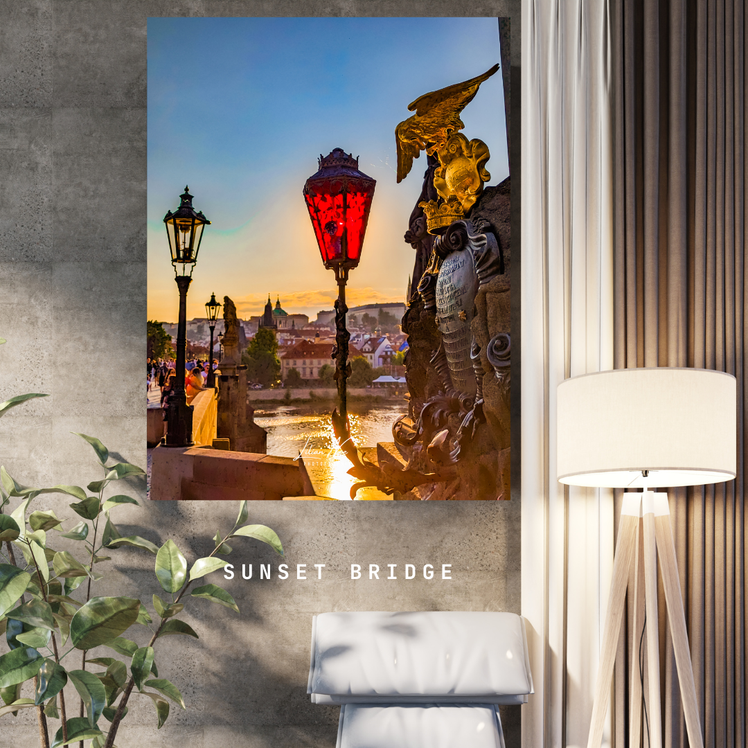 « Capturez la magie du crépuscule avec notre poster mettant en scène un coucher de soleil captivant derrière un lampadaire emblématique sur le pont de Prague. Les tons chauds du ciel en fusion créent une toile de fond spectaculaire, soulignant la silhouette distinctive du lampadaire. Plongez dans l’atmosphère romantique de Prague avec cette pièce visuelle saisissante, où le soleil couchant illumine le charme intemporel du pont. Transformez votre espace en une évasion visuelle captivante, capturant la beauté éphémère de Prague au crépuscule. »