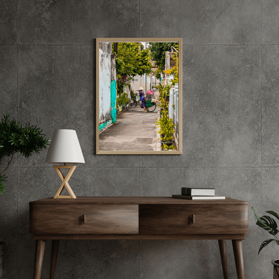 Elle livre des repas aux maisons, apportant une touche humaine et chaleureuse à cette rue vibrante. La lumière du jour éclaire ses gestes attentionnés et la simplicité de son activité, tandis que les détails de la rue offrent un cadre authentique et dynamique à ce moment quotidien.