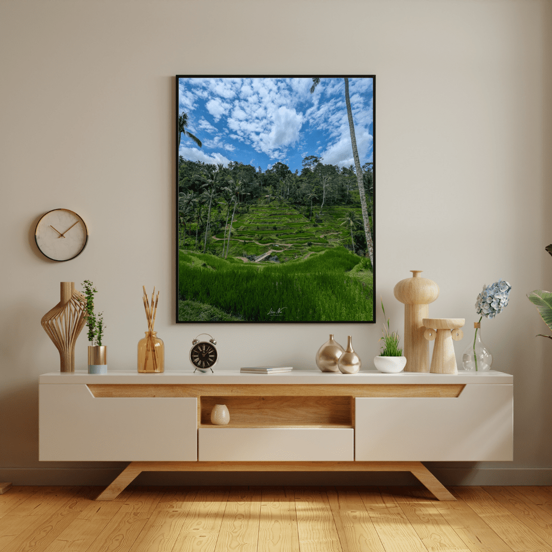 Les terrasses verdoyantes de Tegallalang s’étendent en cascades harmonieuses. Les nuances de vert, baignées de soleil, varient du jade à l’émeraude.
