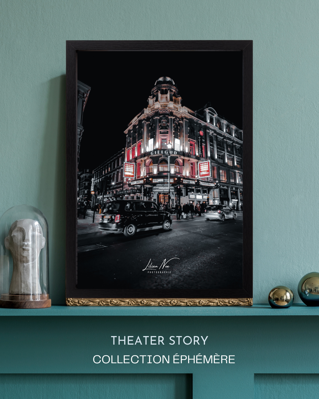 Capturez l’effervescence de Piccadilly Circus avec notre poster mettant en avant les rues animées, les emblématiques taxis londoniens et le majestueux théâtre Gielgud en arrière-plan. Les lumières éclatantes, l’agitation urbaine et l’architecture emblématique créent une scène visuelle dynamique